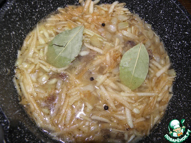 Влить 2 стакана воды, положить лаврушку и перец горошком.