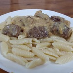 Холодные сливки смешать с мукой, влить тонкой струйкой в мясо, перемешать и потушить еще минут 10-15 - до образования соуса