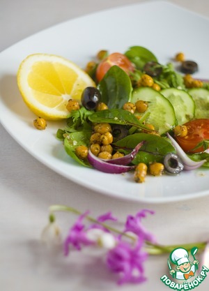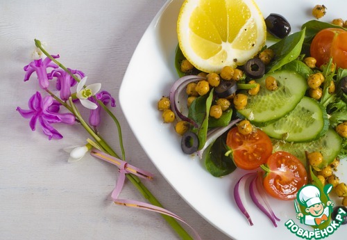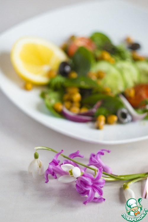 Осталось только разложить салатную зелень по тарелкам, сверху выложить нарезанные овощи и нут, и полить ароматной заправкой!