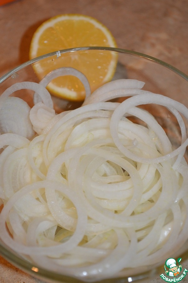 Лук очистить, нарезать тонкими кольцами. Из лимона или граната выжать сок и залить им лук, дать постоять 5 минут, перемешать.