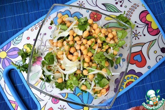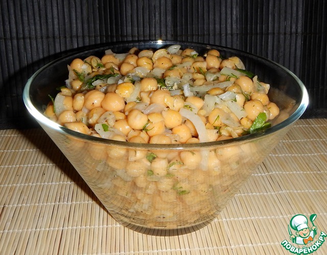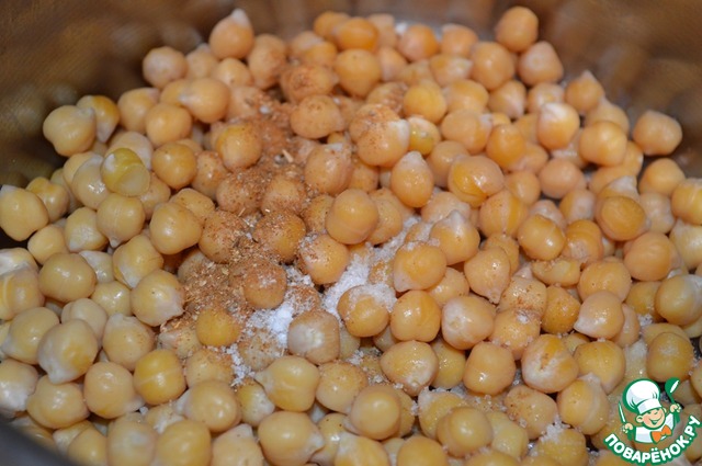 С готового нута слить воду, всыпать соль и специи. Перемешать.