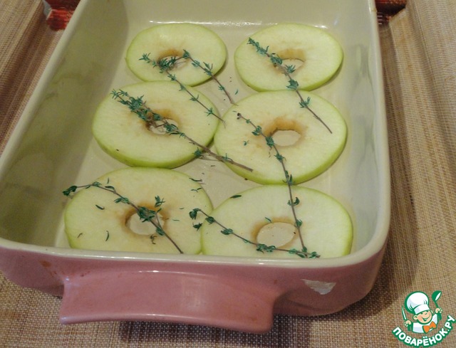 Выкладываем на яблочные слайсы ножки. Обкладываем их яблоками, апельсинами, корицей. Кладем несколько веточек тимьяна.