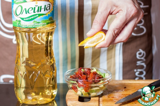 Тем временем приготовить начинку. Авокадо очистить и нарезать кубиком, вяленые томаты мелко порезать.