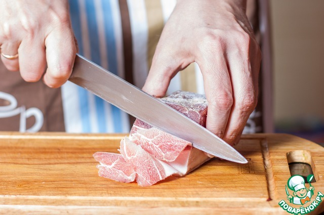 Тонко нарезать ваши мясные изделия, у меня - замороженное соленое сало с толстым слоем мяса. Нарезать сыр, зелень