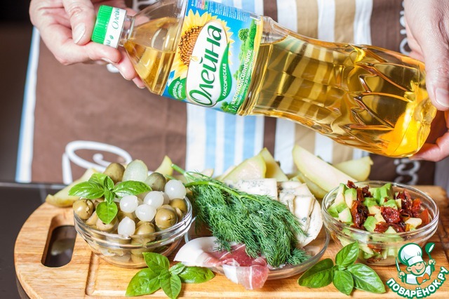 Сыр с плесенью + оливки + маринованный белый лук + веточка укропа