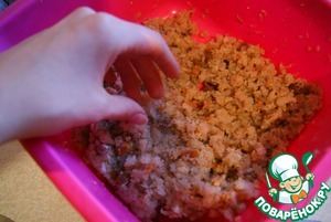 Смешиваем с фаршем луком, крошим хлеб, добавляем яйца, специи и соль. Тщательно перемешиваем.