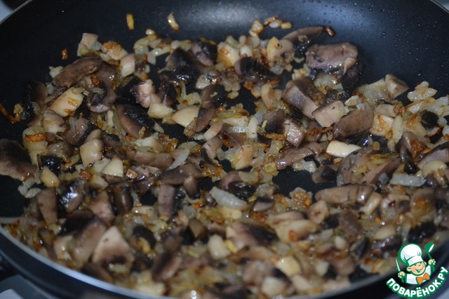 Наливаем в сковороду масло Олейна и обжариваем лук до золотистого цвета, затем кладем грибы и жарим до готовности.