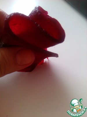 Лучше брать свеклу вытянутой формы. Очищаем ее и на терке нарезаем на тонкие слайсы -