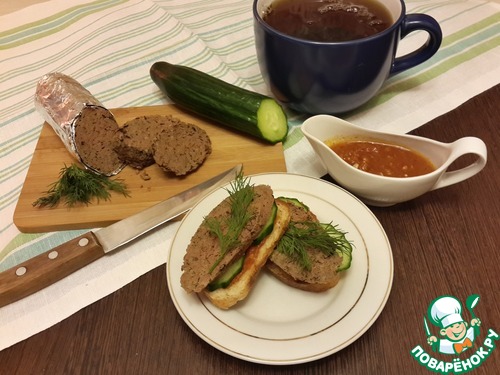 [+5]Фольгу накручивала на длинную бутылку из под коньяка, получились две внушительные "колбасы". Одну съели в тёплом виде, минут 40 я ей в фольге отдохнуть дала, крошилось совсем немного, если потолще кусочки резать, прекрасно форму держат, вкус замечательной печёночной запеканки. А вторую, на ночь отправила в холодильник, не вынимая из фольги. Тут уже можно было резать хоть с листок бумаги. И завтракали уже прекрасным, абсолютно не жирным, нежным и совершенно не сухим печёночным паштетом.