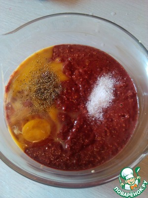 Добавляем в получившуюся массу яйцо, соль и специи, перемешиваем. Масса довольно жидкая, на фарш не похожа.