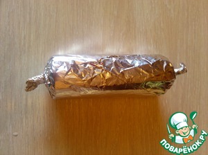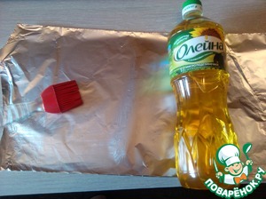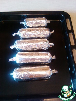 Теперь нам потребуется фольга. Нарываем ее кусочками (я делала где-то 20*40 см), и половину этого листа смазываем маслом "Олейна" - чтобы колбаски не прилипли