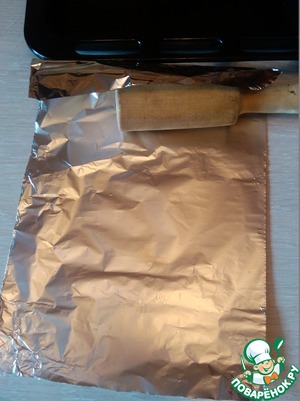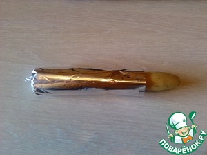 Нам нужен будет какой-то цилиндрический предмет. Я приспособила деревянную толкушку. Кладем ее на фольгу и оборачиваем фольгу вокруг толкушки. Естественно, начинаем с того места, где фольга смазана маслом (чтобы эта часть оказалась внутри)