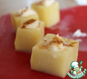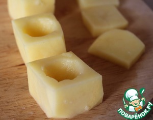 Картофель помыть, почистить. Из каждой картофелины вырезать кубик высотой приблизительно 4 см. Снять с кубика слой в 5 мм, это будет "крышкой", отложить в сторону. В оставшихся кубиках с помощью маленькой ложки сделать отверстие так, чтобы оставались стенки толщиной минимум 5 мм.