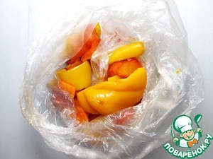 • Перец очищаем от семян, режем на несколько частей и запекаем в духовке при 190 градусах Цельсия до мягкости, даем немного остыть, складываем в пакет и завязываем его. Остужаем перец в таком виде.