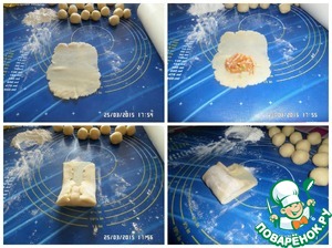 Тесто делим на 8-10 частей. Раскатываем каждую часть как лепешку, кладем начинку. Сворачиваем конвертиком.