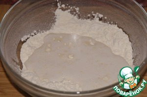3 стакана муки просеять в широкую миску, добавить соль и подошедшие дрожжи.