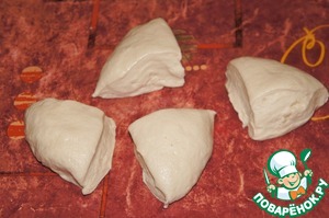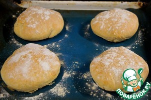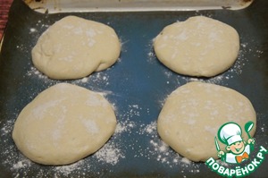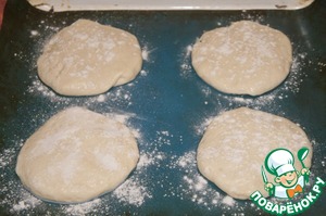 Из каждой части скатать шарик. Из каждого шарика раскатать круг диаметром около 10-12 см и высотой 1-1,5 см. Выложить их на выстланный пергаментом противень, предварительно посыпав его мукой.