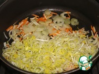 В глубоком сотейнике разогреть пару ложек растительного масла и спассеровать морковь с корневым сельдерем до полуготовности. |