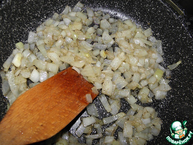 В глубокой сковороде разогреть сливочное и растительное масло, добавить нарезанный лук и обжарить его. |