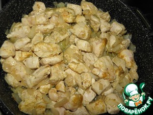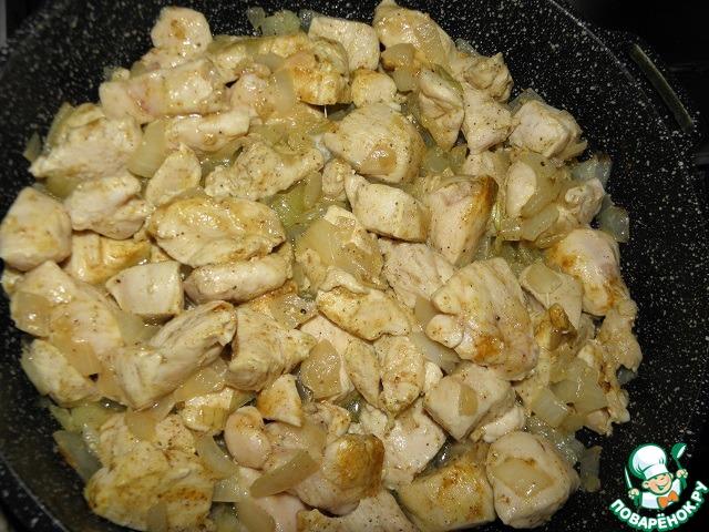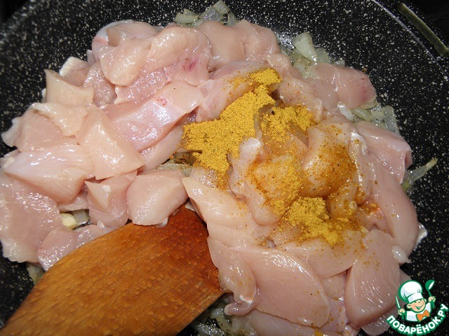 Куриное филе нарезать средними кусочками, добавить к луку, а так же добавить карри и специи |