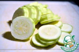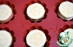 Выложить в формочки поочерёдно кабачки и помидор, начиная и заканчивая кабачками.