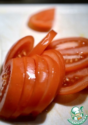 Помидор тоже нарезать тонкими кружками (полукружками).