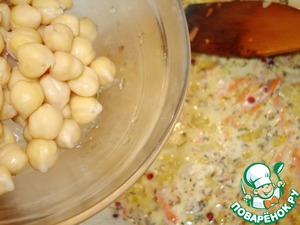 Добавляем отварной нут и немного тушим до мягкости овощей.
