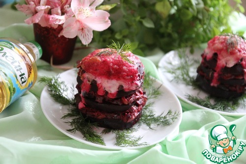 На кружок свеклы положить приготовленной начинки, прикрыть вторым кружком, положить начинку и прикрыть третьим, положить начинку и прикрыть четвертым кружком свеклы
