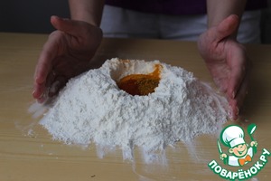 Итак, в муку добавляем дрожжи, карри, паприку, соль и сахар. Все перемешиваем -
