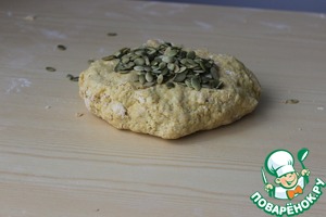 Когда тесто начинает формироваться, добавляем семечки тыквы и начинаем вымешивать тесто