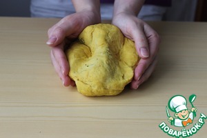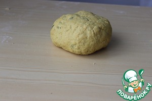 Далее достаем тесто и обминаем. Вот такого насыщенного цвета оно стало