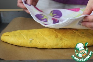 Выкладываем на противень, застеленный пекарской бумагой, и накрываем полотенчиком на минут 10. Тем временем включаем духовку на 180 градусов