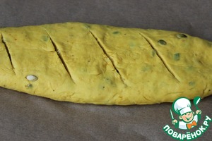 Придаем нашему хлебу форму (лучше делать сплющенную, чтобы лучше пропеклось) и делаем насечки
