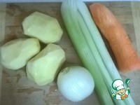 Для начала поставим кастрюлю с водой на огонь. (У меня примерно 3 литра). Подготовим необходимые овощи: картофель, морковь, сельдерей и лук. |