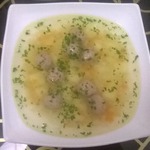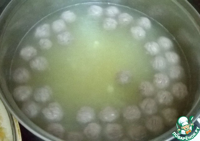 Итак наш картофель готов или практически готов (зависит от вашей скорости, можно заготовить фрикадельки заранее). Овощи выключаем и под крышку, пусть доходят. Картофель солим, добавляем огня, чтоб вода прям закипела и забрасываем наши фрикадельки. Как закипит с ними, тогда можно убавить. Сначала они будут на дне, потом всплывут. Пусть поварятся минут 10. |