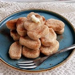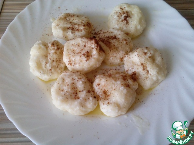 Подаём вареники со сливочным маслом и корицей. Или любым другим соусом, и даже фруктами.