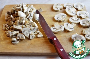Грибы порезать кубиками, для подачи порезать грибы слайсами, как на фото.