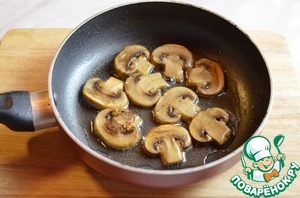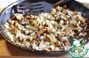 Шампиньоны которые порезали кубиками, обжарить на оливковом масле до полной готовности вместе с репчатым луком порезанным небольшими кубиками, слегка посолить и поперчить.