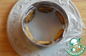Решила и в это раз сделать необычную подачу, для гороховой каши. Для этого я взяла кулинарное сервировочное кольцо, для надежности обложила пищевой пленкой, этого можно не делать. Но я перестраховалась. В кольцо как на фото выложить обжаренные грибы.