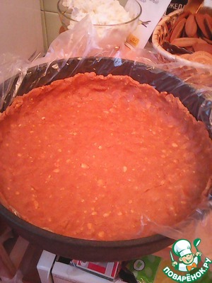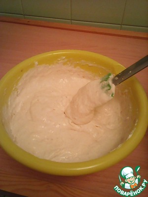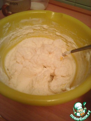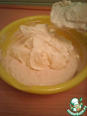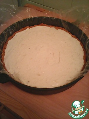 Аккуратно подмешать взбитые сливки к творожено-банановой массе и выложить её в основу из печенья. (Очень важно чтоб ворожено-банановая масса была достаточно охлаждённой иначе сливки могут "упасть").