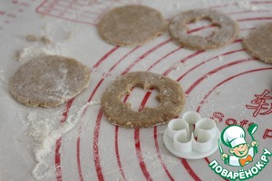 Тесто раскатать максимально тонко. От того, как Вы раскатаете, будет зависеть вкус печенья. Чем тоньше, тем более хрустящими получатся печенья, и наоборот. Стол и скалку припыляем мукой (пшеничной). Стаканом вырезать кружки. Половину кружков оставить целыми, а в остальных с помощью вырубки для печенья в центре сделать отверстия в виде цветочков.