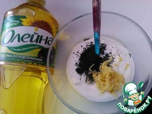 • Пока булочки пекутся, делаем соус: смешиваем сметану (йогурт) с нарубленной зеленью, измельченным чесноком и маслом "Олейна" - в этом соусе хорошо "отыграет" растительное масло с добавлением оливкового