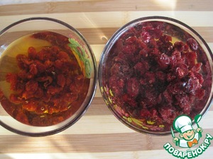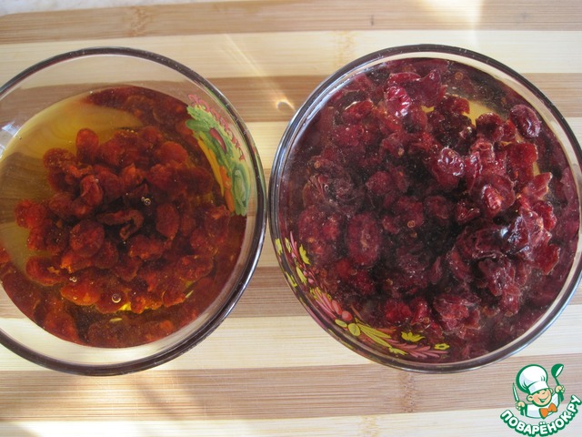 Замочим на 2 часа вишню и клюкву. В чём замачивать я не стала указывать в ингредиентах-это дело вкуса. На выбор-вода, сироп, алкоголь, настой чая.