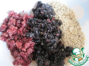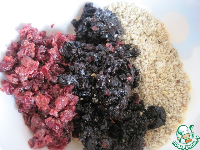 Измельчим в блендере орехи, чернослив, вишню и клюкву. Насколько мелко измельчить-это опять-таки дело вкуса. Я измельчила не в однородную массу. Мне хотелось, что б ощущались кусочки каждого ингредиента. Смешаем всё и сформируем шарики-конфетки. Лепятся они прекрасно, в холодильник убирать не нужно ни массу, ни готовые конфеты.