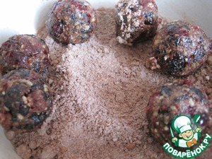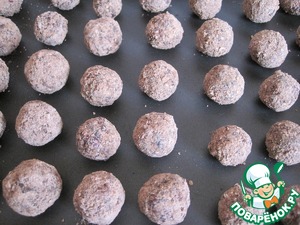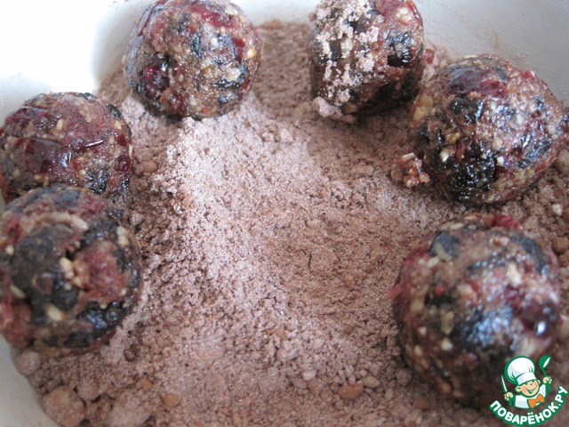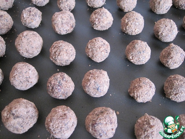 Для обсыпки: орехи измельчим в крошку, смешаем с какао и с пудрой. Обваляем конфеты.