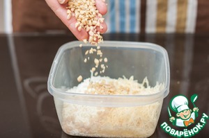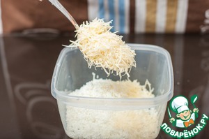 Творог протереть через сито, добавить мелко натертый пармезан, но не весь. 1/3 пармезана отложить.