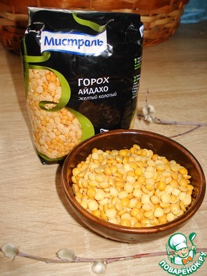 Лучше всего подойдет желтый горох, я беру Айдахо желтый колотый от фирмы Мистраль. Его не надо замачивать предварительно, просто промыть и варить 30-40 минут до готовности.