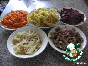 Все обжарить по отдельности. Остудить (лишнее масло отцедить), соединить и аккуратно перемешать.