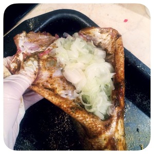 Судака смазываем внутри и снаружи бальзамическим соусом, либо медом с лимонным соком и солью. Оставляем пока делаем лук.