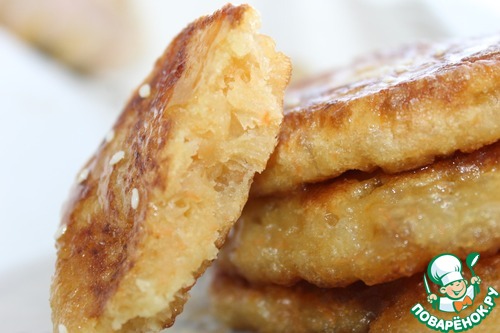 А вот обещанные оладьи, сделав тесто по гуще и добавив немного сахара и тёртой сырой моркови,